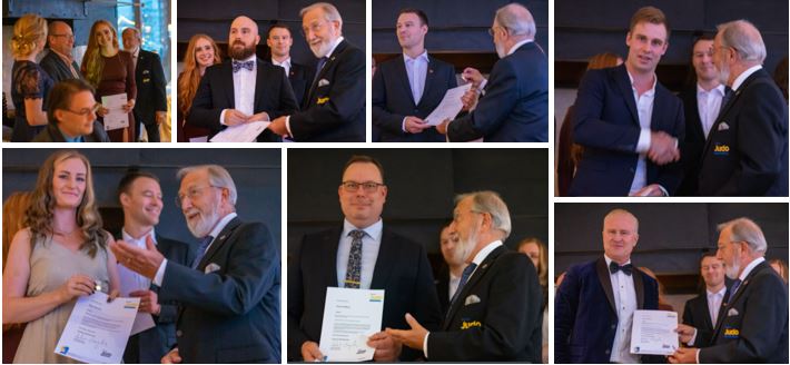 Svenska Judoförbundets representant, former president Alf Tornberg, intar scenen framför den öppna brasan, tillsammans med jubileumsgeneralerna Conny Dieserud och Malin Mällo, för att dela ut de fina utmärkelserna i form av förtjänsttecken. Detta för att visa särskild uppskattning och premiera några av våra aktiva ledare, ledare som under många, många år sett till att föreningen hålls vid god vivör.